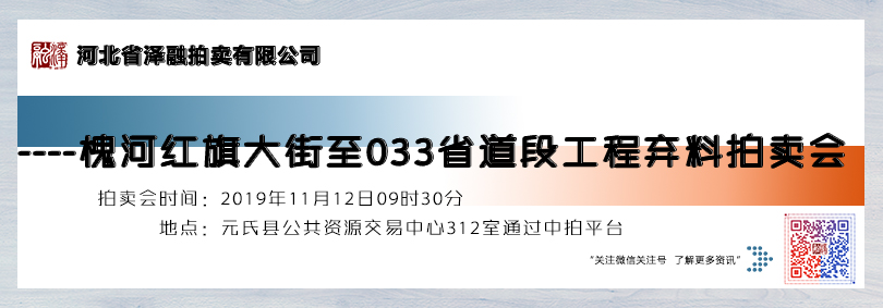 - 拍賣公告 受元氏縣財(cái)政局委托,我公司定于2019年11月12日09時(shí)30分在元氏縣公共資源交易中心312室通過中拍平臺(tái)(https://paimai.caa123.org.cn)對以下標(biāo)的進(jìn)行公開拍賣,現(xiàn)將有關(guān)事宜公告如下: 一、拍賣標(biāo)的:槐河紅旗大街至033省道段工程棄料(詳見拍賣文件…