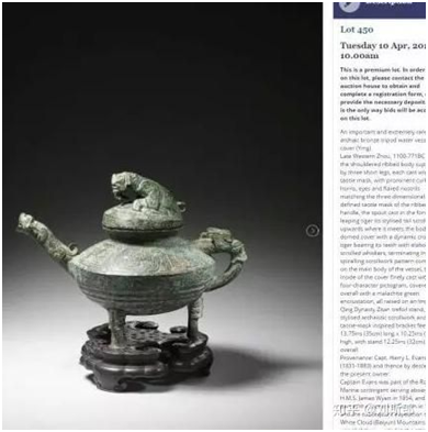 英國(guó)方面,2018年4月,英國(guó)肯特郡的坎特伯雷拍賣行無(wú)視中國(guó)方面的抗議和國(guó)際法的規(guī)定,公然拍賣一件鴉片戰(zhàn)爭(zhēng)期間的戰(zhàn)爭(zhēng)掠奪品,據(jù)悉,該文物為我國(guó)西周青銅器“虎鎣”,當(dāng)場(chǎng)僅20分鐘就被拍出41萬(wàn)英鎊的高價(jià)。